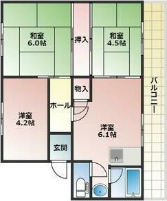 | 間取り | 3DK | 間取り詳細 | 和室6 和室4.5 洋室4.2 DK6.1 |