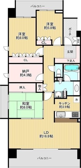 | 間取り | 3SLDK | 間取り詳細 | 洋室8 洋室5.8 和室6 LD16.8 K3.9 その他4.3 |