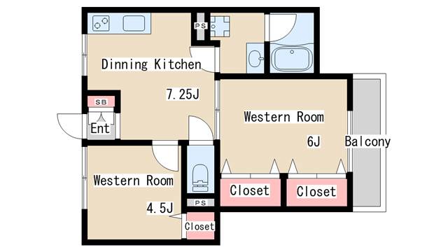 | 間取り | 2DK | 間取り詳細 | 洋室4.5 洋室6 DK7.25 |