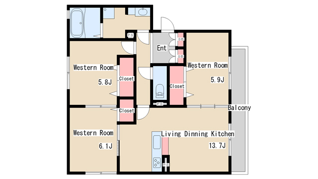 | 間取り | 3LDK | 間取り詳細 | 洋室5.8 洋室5.9 洋室6.1 LDK13.7 |