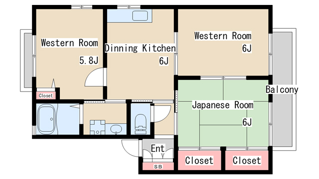 | 間取り | 3DK | 間取り詳細 | 和室6 洋室5.8 洋室6 DK6 |
