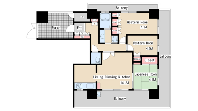 | 間取り | 3LDK | 間取り詳細 | 和室4.5 洋室4.5 洋室7.1 LDK14.2 |