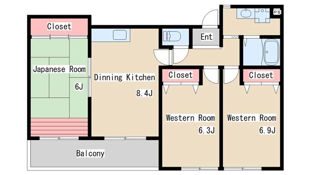 | 間取り | 3DK | 間取り詳細 | 和室6 洋室6.3 洋室6.9 |