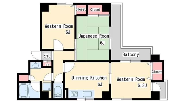 | 間取り | 3DK | 間取り詳細 | 和室6 洋室6 洋室6.3 |